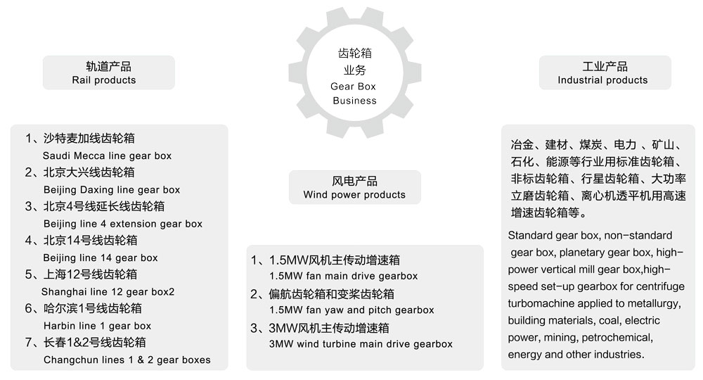 冶金、建材、煤炭、電力、礦山、石化、能源等行業(yè)用標準齒輪箱、非標準齒輪箱、行星齒輪箱、大功率立磨齒輪箱、離心機透平機用高速增速齒輪箱等。